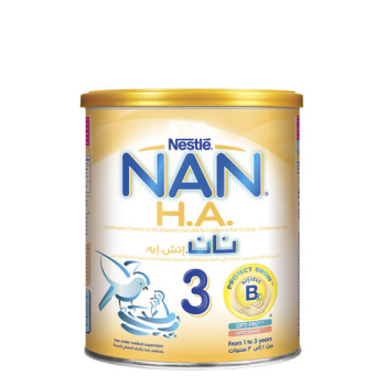 NAN H.A. 3 Toddler is a premium, nutrient-enriched milk supplement specially formulated with age appropriate ingredients to help supplement your toddler�s diet from 1 year of age. It contains 14 essential vitamins and minerals to support growth and development, a special blend of good fats plus probiotic Bifidus BL. It also has no added sucrose to help support good eating habits. For hygiene and convenience, it is available in an innovative packaging format with a separate storage area for the scoop, and a semi-transparent window. |
